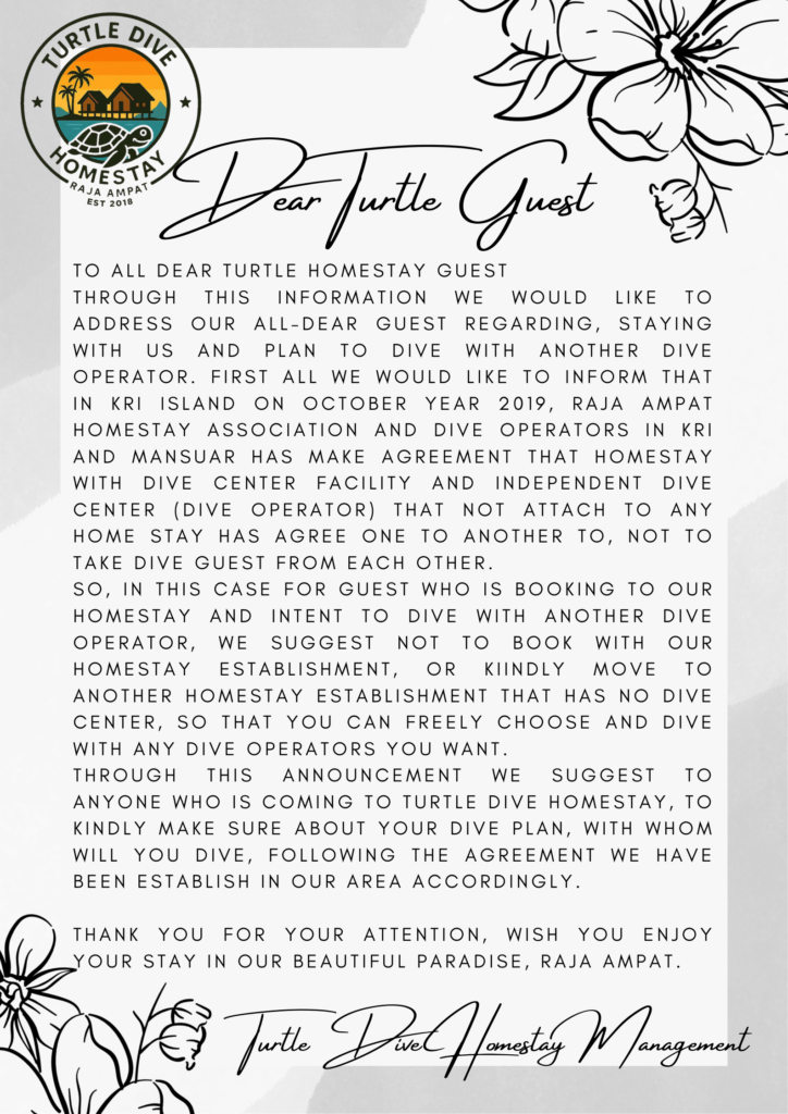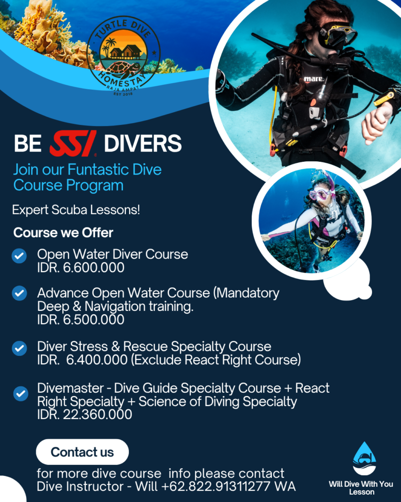 | For dive reservation please contact Office Number at +62.812.4323.7470 – WhatsApp or Call – Or come at Evening around 20:00 in Turtle Dive Homestay restaurant | ||